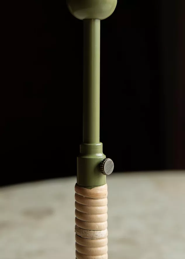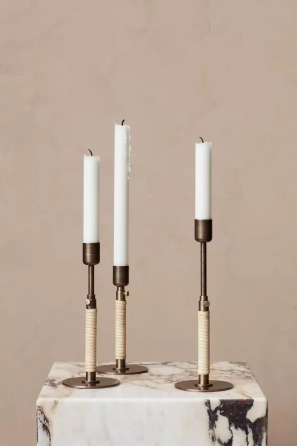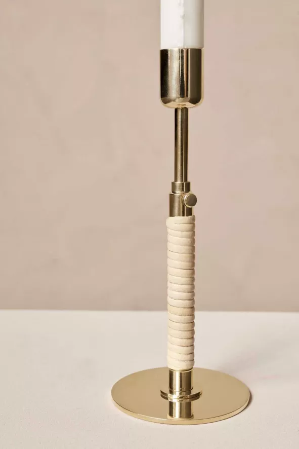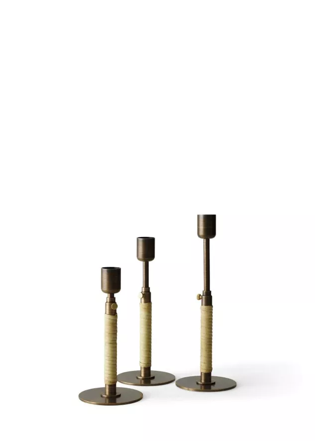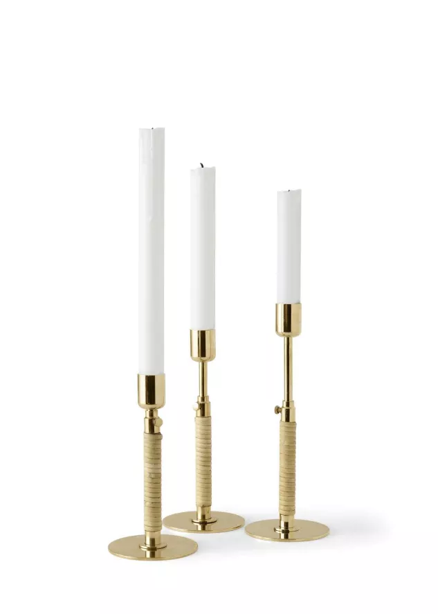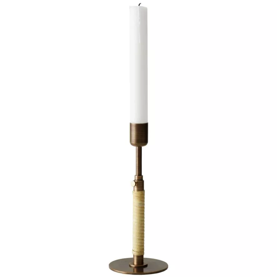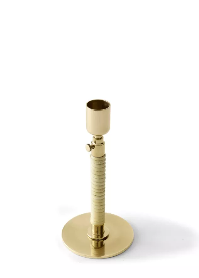 Dit is de Duca kaarsenstandaard van Audo Copenhagen. De kaarsenstandaard bestaat uit gelakt messing en rotan. De standaard is 16.5 centimeter hoog (met de mogelijkheid tot verlenging tot 24 centimeter) en heeft een doorsnede van 8 centimeter. De standaard weegt 300 gram.