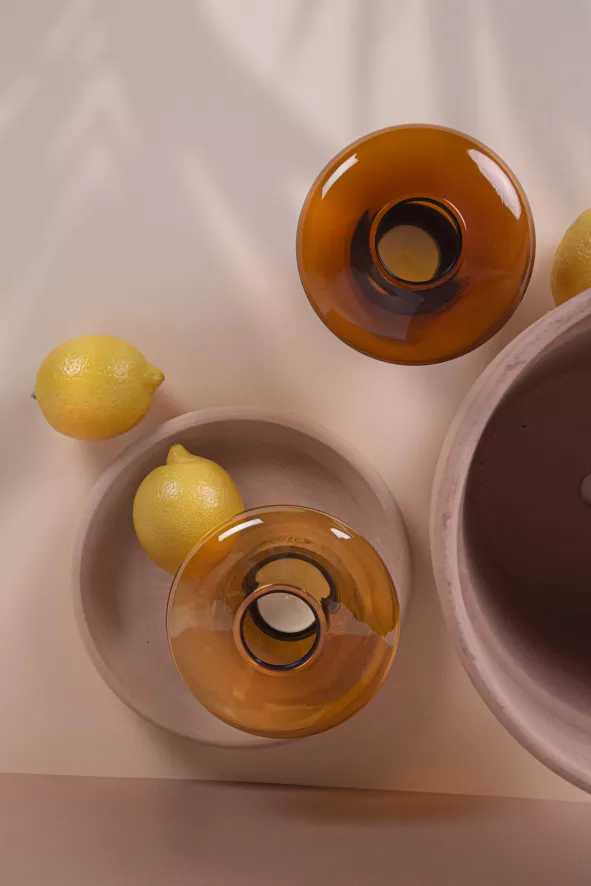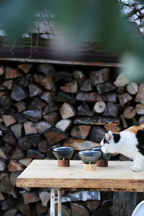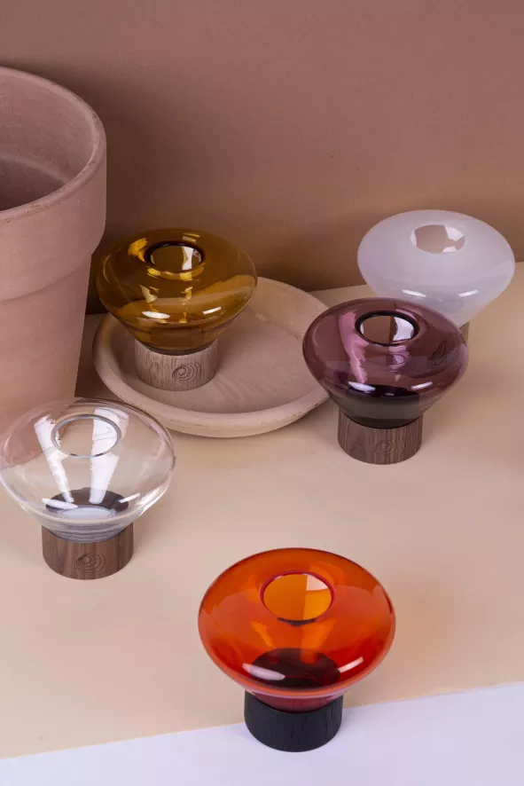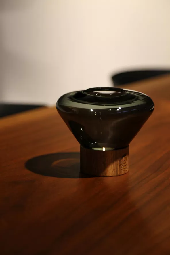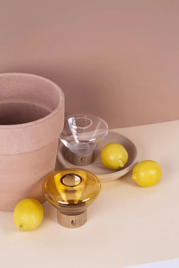 Het Muffins theelicht is 10 centimeter hoog en heeft een diameter van 13 centimeter. Het theelicht is gemaakt van mondgeblazen glas en eikenhout of walnoothout. Het vakmanschap dat bij de productie wordt toegepast, volgt een eeuwenoude traditie en ervaring van glasblazers. De glazen kap wordt gevormd uit meerdere lagen gesmolten glas, die elk nauwkeurig worden onderzocht alvorens in de mal te worden geblazen. De meesterlijke combinatie van materialen zorgt voor een iconische status van de Muffins serie van Brokis.