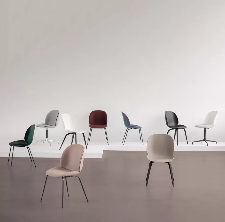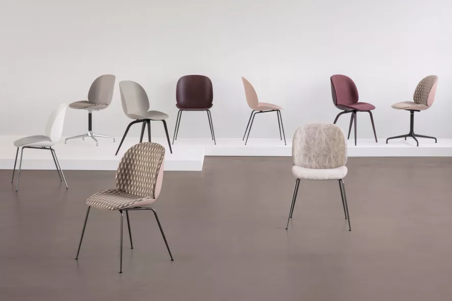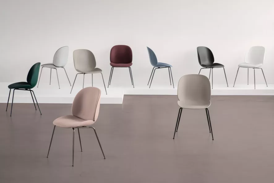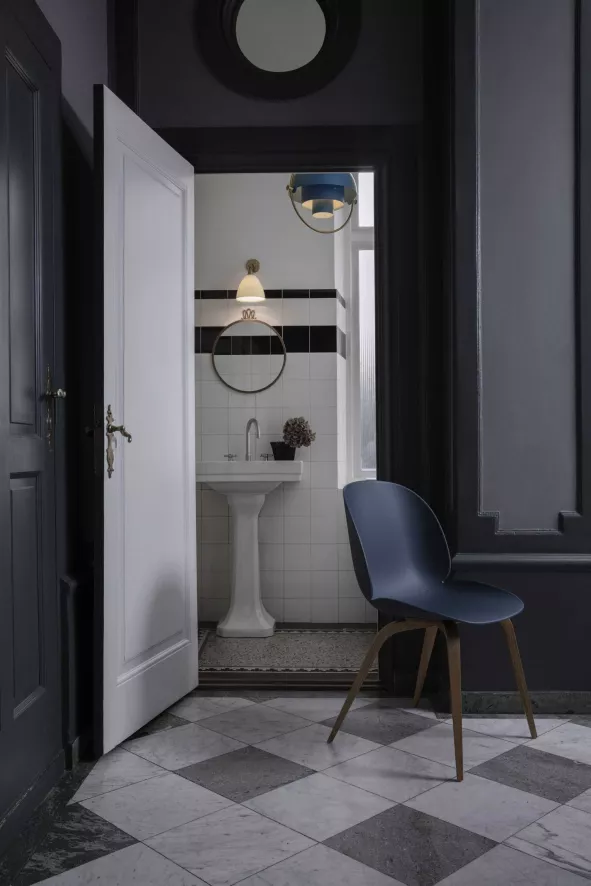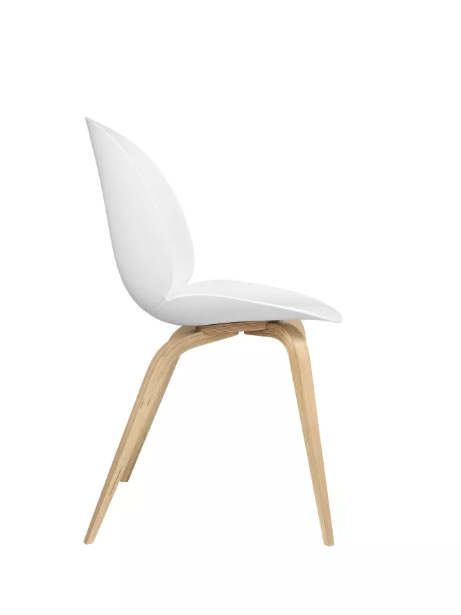 De Gubi Beetle stoel met naturel eiken onderstel is ontworpen door GamFratesi.