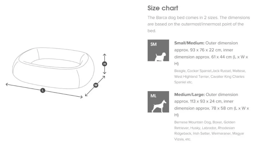 De MiaCara Barca hondenmand small/medium is ontworpen door Hans Thyge & Co. De Barca hondenmand small/medium van MiaCara heeft een lengte van 93 centimeter, een breedte van 76 centimeter en een hoogte van 22 centimeter. De hondenmand heeft een afneembare, wasbare hoes van Polyester Trevira CS die met stoom gereinigd mag worden of in de wasmachine, tot 60 graden Celsius gewassen mag worden. Na het reinigen, dient de hoes aan de lucht gedroogd te worden. Het mag niet in de droogtrommel. De hoes mag eventueel op lage temperatuur gestreken worden. De mand heeft een binnen kussen van katoen en polyester en is gevuld met stabiel, duurzaam, hypoallergeen en elastisch polyurethaanvulling. De zijkanten van de mand zijn gemaakt van polyurethaan en koud schuim en zijn waterafstotend. Deze kunnen het beste met een vochtige doek afgenomen worden. Deze hondenmand is geschikt voor Beagles, Cocker Spaniëls, Jack Russels, Maltezers en andere kleine tot middelgrote hondenrassen. De Barca hondenmand small/medium van MiaCara is in verschillende kleuren en formaten verkrijgbaar.