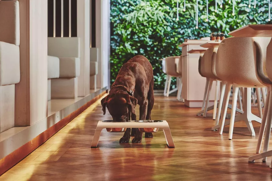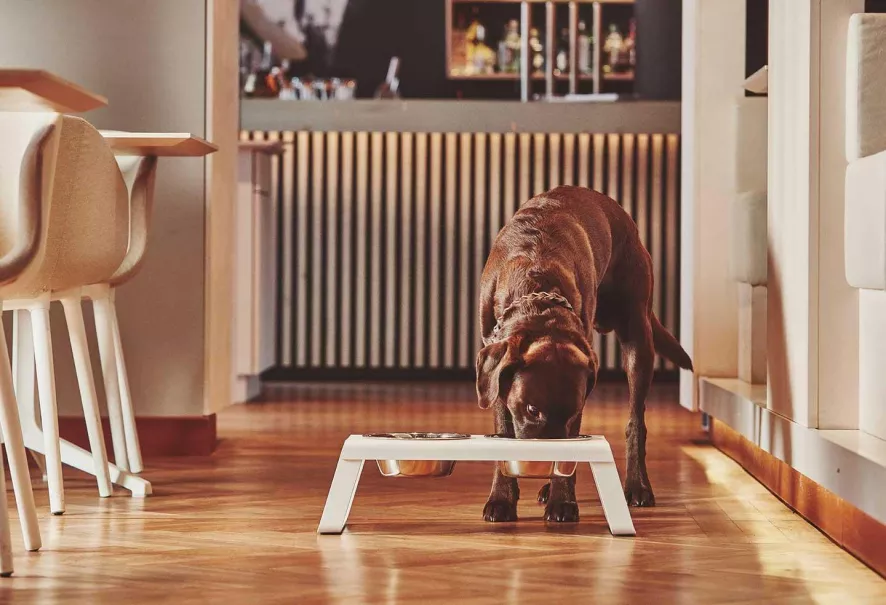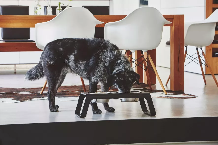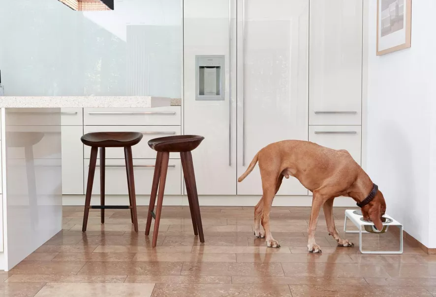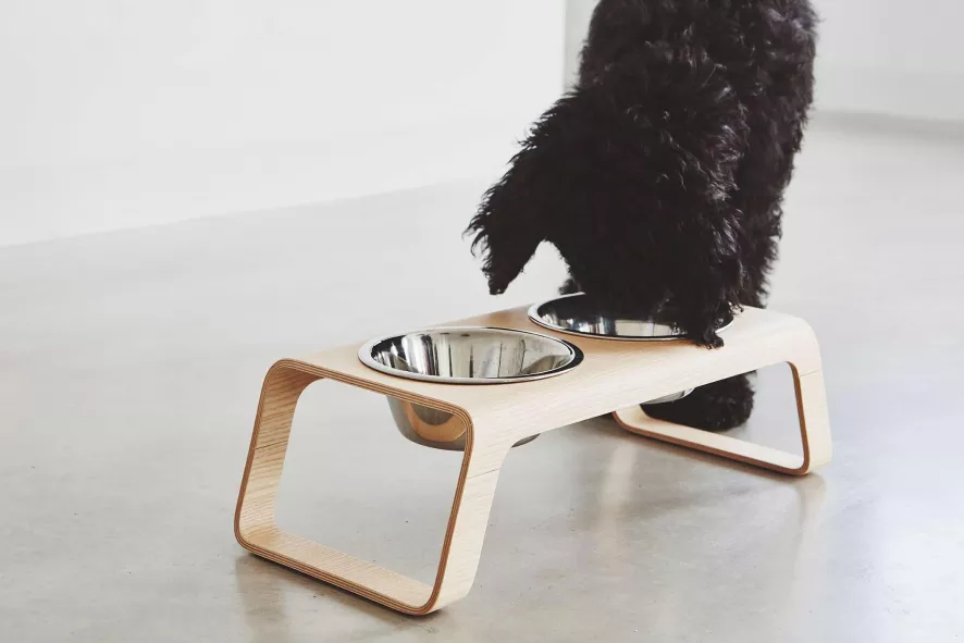 De Desco hondenvoerbak medium is 58 centimeter lang, 26 centimeter breed en 17 centimeter hoog. Door siliconen aan de onderkant verschuift de bak niet maar blijft hij altijd op zijn plek. Het frame van het ontwerp is verkrijgbaar in twee verschillende materialen: multiplex of aluminium. Het aluminium is gepoedercoat in verschillende kleuren. Bij de multiplex versie heb je keuze uit walnoot of essenhout, in verschillende coatings. De bakken zijn van roestvrijstaal en hebben ieder een inhoud van 1,3 liter en een diameter van 17 centimeter en kunnen gewoon in de vaatwasser. De Desco hondenvoerbak medium heeft een German Design Award 2019 gewonnen en is ontworpen door Mathias De Ferm.