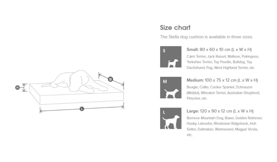 Het MiaCara Stella hondenkussen small is 80 centimeter lang, 60 centimeter breed en 10 centimeter hoog. Dat maakt het hondenkussen geschikt voor kleine honden zoals een Jack Russell, Yorkshire Terriër of een mopshond. Het kussen is 60% gemaakt van katoen en 40% van polyester. De vulling van het kussen is 100% gemaakt van polyurethaanschuim. Dat betekent dat het hondenkussen stabiel, duurzaam, hypoallergeen en permanent elastisch is. Het kussen kan worden gewassen tot 60ºC. Er wordt echter aangeraden om géén gebruik te maken van gechloreerde en chemisch agressieve wasproducten. Het MiaCara Stella hondenkussen is in verschillende kleuren beschikbaar. Daarnaast is het hondenkussen verkrijgbaar in verschillende formaten. De Stella hondenkussen S is geschikt voor kleine honden als een Jack Russel, bulldog of een Yorkshire Terrier.