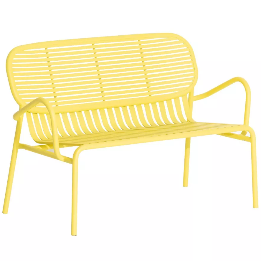 Dit is de Week-end tuinbank 2-sits van Petite Friture. De tuinbank is gemaakt van aluminium en daardoor geschikt voor buiten. De bank is 113.5 centimeter lang, 49 centimeter breed en 77 centimeter hoog. De zithoogte is 40 centimeter. Deze tuinbank is er in verschillende kleuren en varianten.