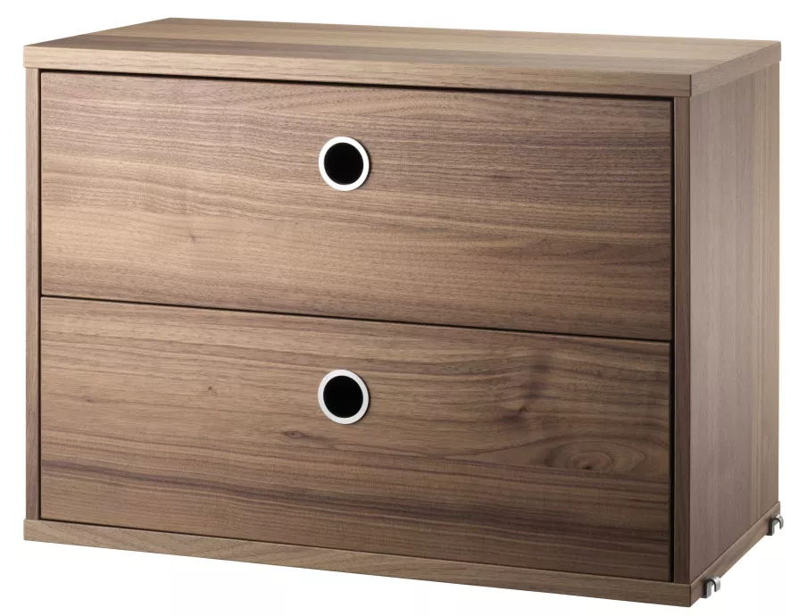 Dit is de Kast met twee lades 58x30x42 cm van String. De kast heeft een breedte van 58centimeter en een diepte van 30 centimeter. De kast is leverbaar in verschillende varianten.