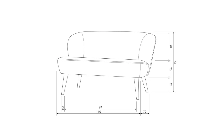 Het Sara bankje van WOOOD heeft een hoogte van 73 centimeter, een breedte van 110 centimeter en een diepte van 72 centimeter. De zithoogte is 43 centimeter, met een zitdiepte van 50 centimeter. De bank is verkrijgbaar in verschillende uitvoeringen. Het bankje is gestoffeerd met een 100% polyester fluwelen stof of zachte teddy stof. De poten van het bankje zijn gemaakt van zwart gelakt berkenhout. Het wordt aangeraden om de bank regelmatig te stofzuigen met een schone borstel en bij eventuele vlekken om een schone doek of tissue te gebruiken om het schoon te deppen. Het is belangrijk om NIET te wrijven. De meeste vloeistoffen zijn uit het bankje te halen met lauw water. De velvet stof scoort 100.000 op de schaal van Martindale en is daarmee geschikt voor intensief woongebruik. De uitvoering met Teddy stof scoort 40.000 op de schaal van Martindale en is daarmee geschikt voor normaal woongebruik.